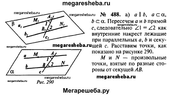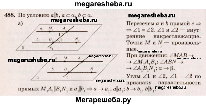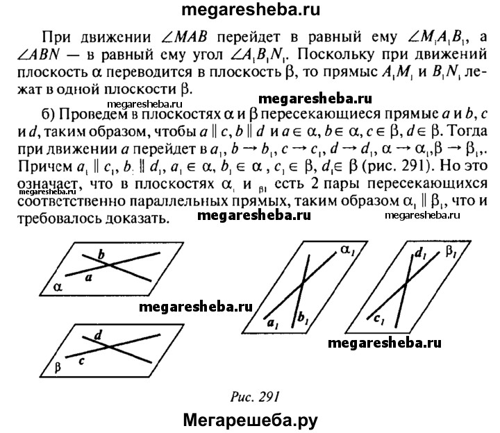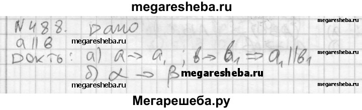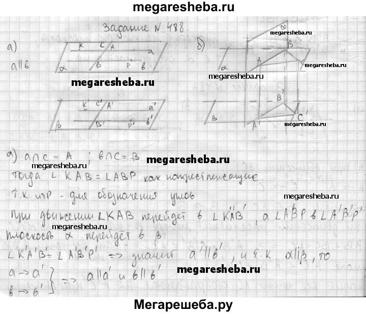 488. Докажите, что при движении: а) параллельные прямые отображаются на параллельные прямые; б) параллельные плоскости отображаются на параллельные плоскости.
