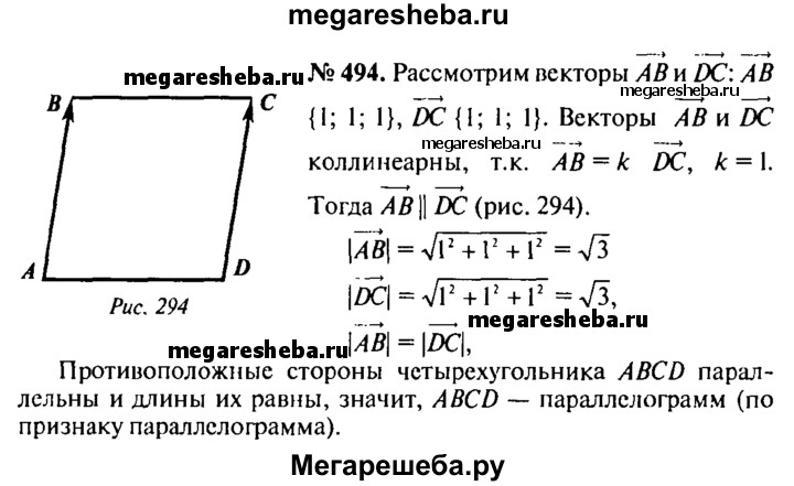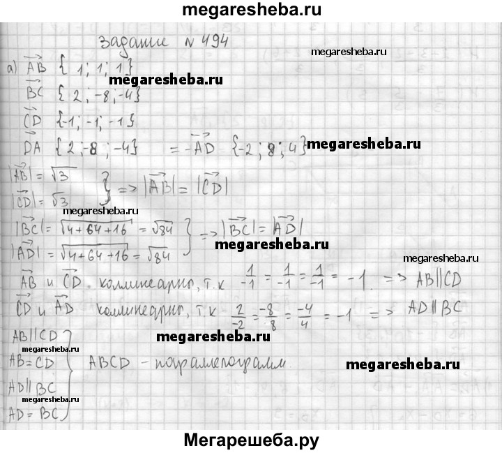 494. Даны точки А (3; 5; 4), В (4; 6; 5), С (6; -2; 1) и D (5; -3; 0). Докажите, что ABCD — параллелограмм.