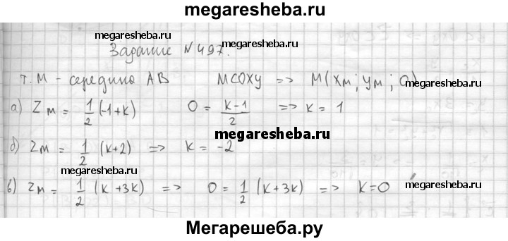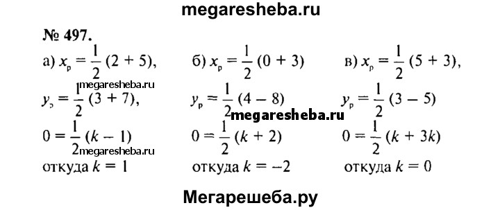 497. Середина отрезка АВ лежит в плоскости Оху. Найдите k, если: а) А (2; 3; -1), В (5; 7; k); б) А (0; 4; k), В (3; -8; 2); в) А (5; 3; k), В (3; -5; 3k).