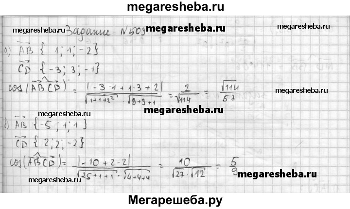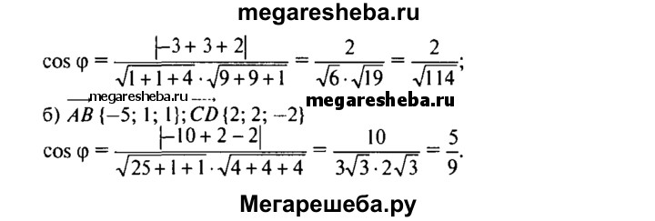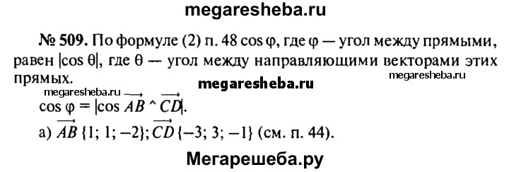 509. Вычислите косинус угла между прямыми АВ и CD, если: а) А (7; -8; 15), В (8; -7; 13), С (2; -3; 5), D (-1; 0; 4); б) А (8; -2; 3), В (3; -1; 4), С (5; -2; 0), D (7; 0; -2).