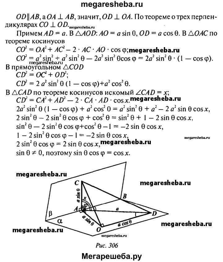 516. Дан двугранный угол CABD, равный ф (ф < 90°). Известно, что АС перпендикулярна АВ и угол DAB = θ. Найдите cos угла CAD.