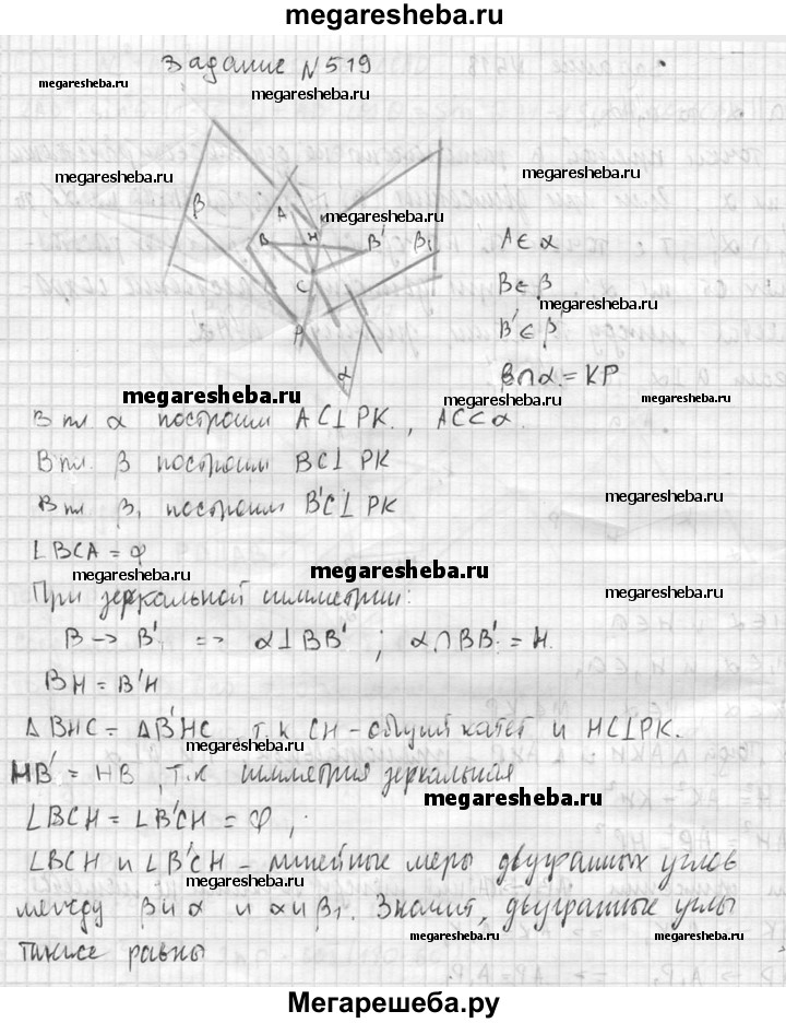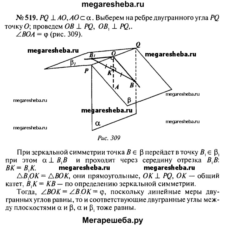 519. При зеркальной симметрии относительно плоскости α плоскость β отображается на плоскость β₁. Докажите, что если плоскость β образует с плоскостью α угол ф, то и плоскость β₁ образует с плоскостью α угол ф.