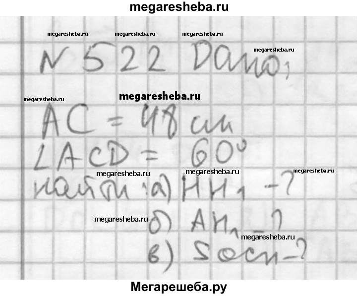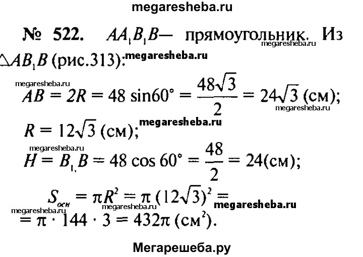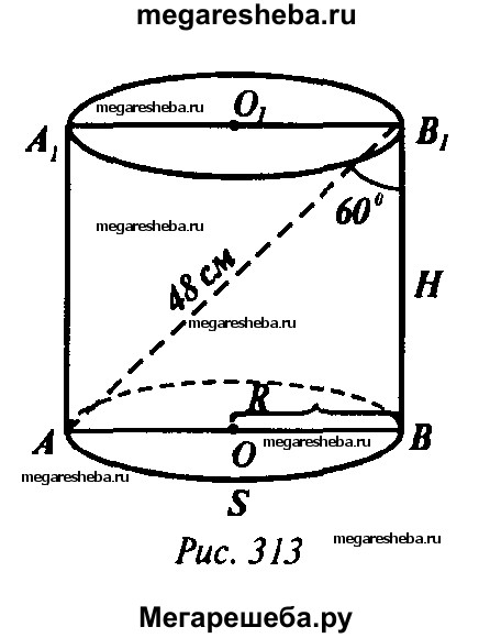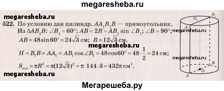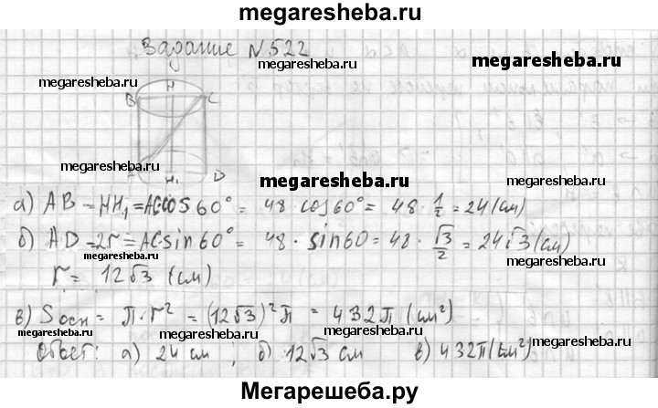 522. Диагональ осевого сечения цилиндра равна 48 см. Угол между этой диагональю и образующей цилиндра равен 60°. Найдите: а) высоту цилиндра; б) радиус цилиндра; в) площадь основания цилиндра.