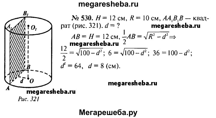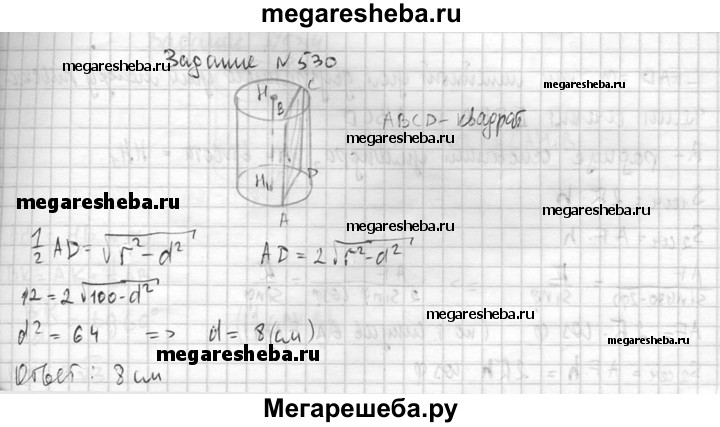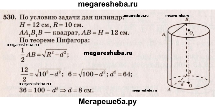 530. Высота цилиндра равна 12 см, а радиус основания равен 10 см. Цилиндр пересечен плоскостью, параллельной его оси, так, что в сечении получился квадрат. Найдите расстояние от оси цилиндра до секущей плоскости.