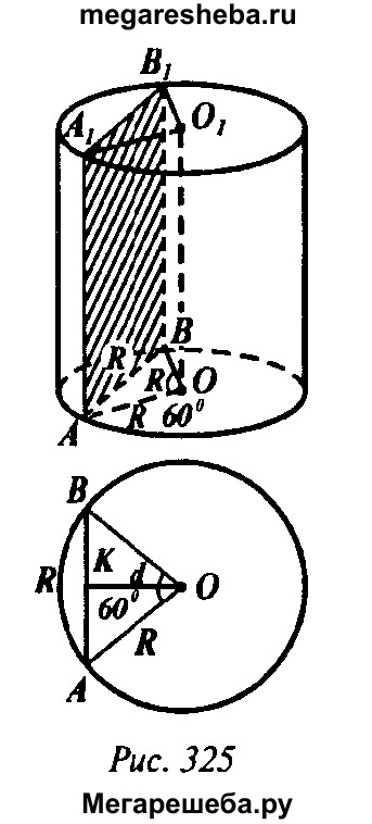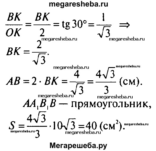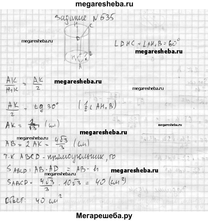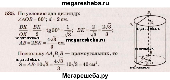 535. Плоскость, параллельная оси цилиндра, отсекает от окружности основания дугу в 60°. Образующая цилиндра равна 10√3 см, расстояние от оси до секущей плоскости равно 2 см. Найдите площадь сечения.