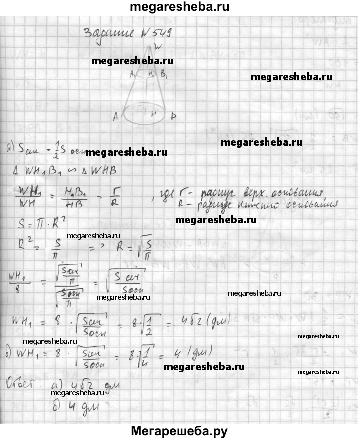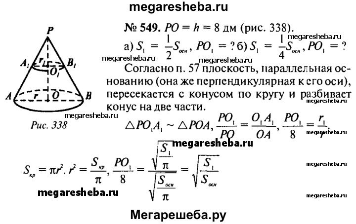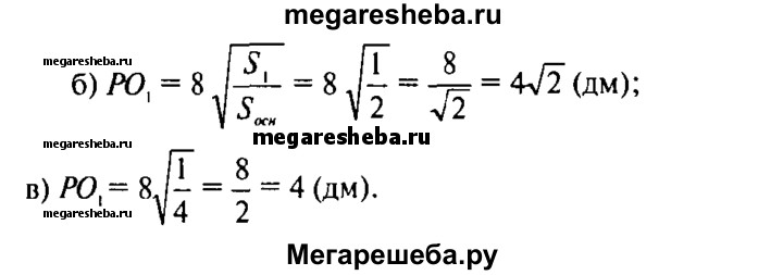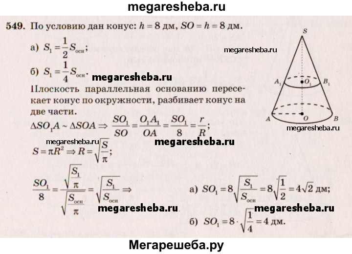 549. Высота конуса равна 8 дм. На каком расстоянии от вершины конуса надо провести плоскость, параллельную основанию, чтобы площадь сечения была равна: а) половине площади основания; б) четверти площади основания?