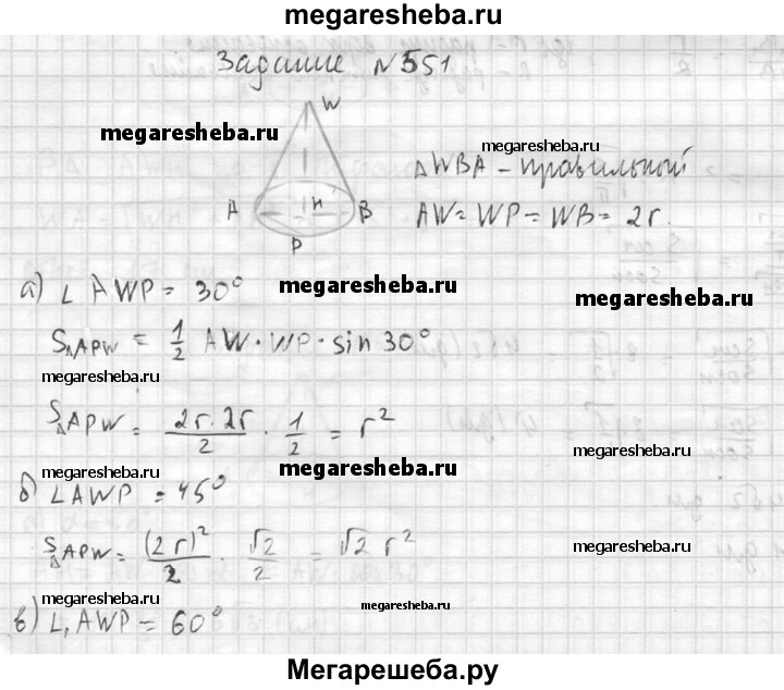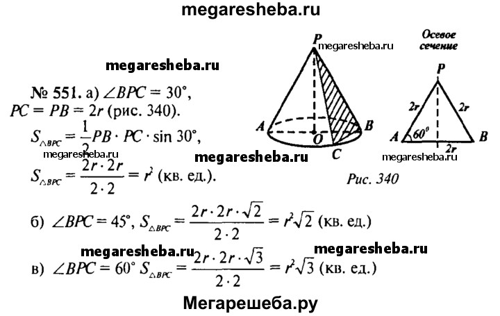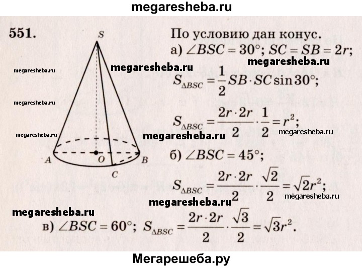 551. Осевое сечение конуса — правильный треугольник со стороной 2r. Найдите площадь сечения, проведенного через две образующие конуса, угол между которыми равен: а) 30°; б) 45°; в) 60°.