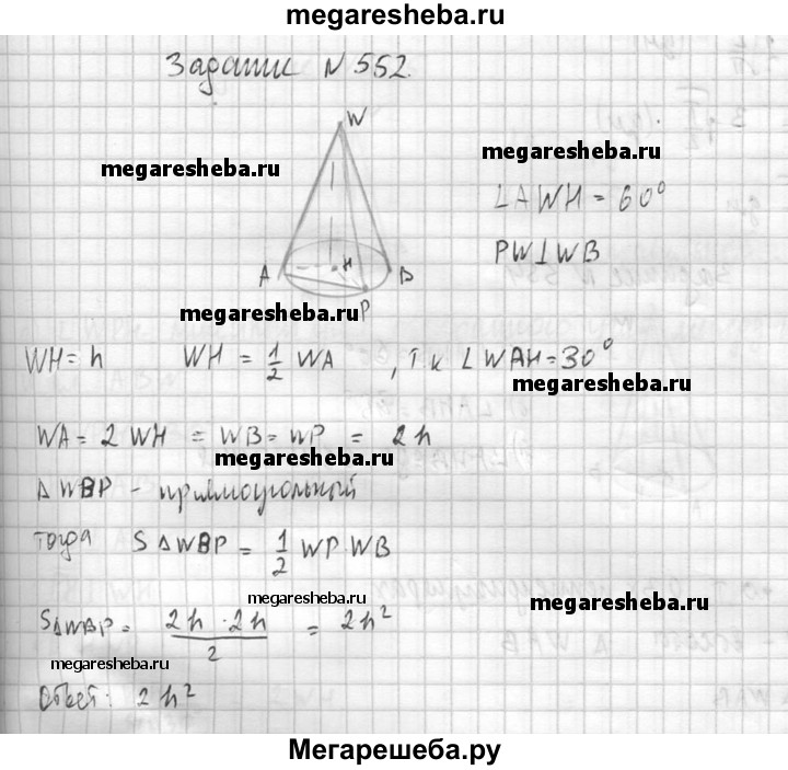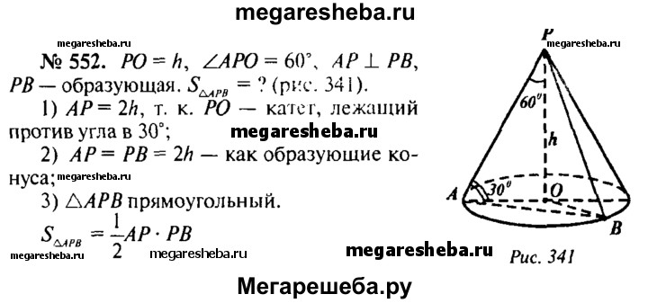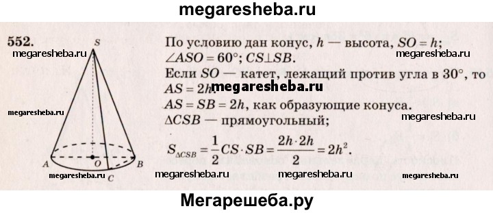 552. Высота конуса равна h, а угол между высотой и образующей конуса равен 60°. Найдите площадь сечения конуса плоскостью, проходящей через две взаимно перпендикулярные образующие.