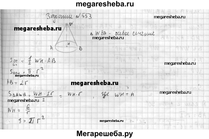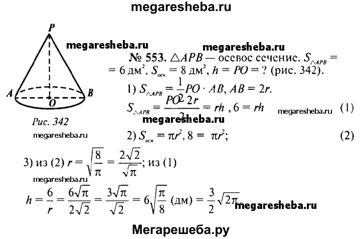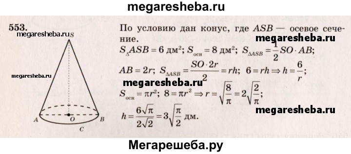 553. Найдите высоту конуса, если площадь его осевого сечения равна 6 дм², а площадь основания равна 8 дм².
