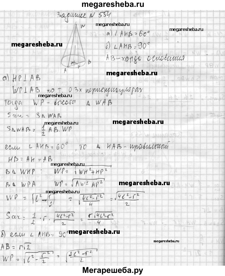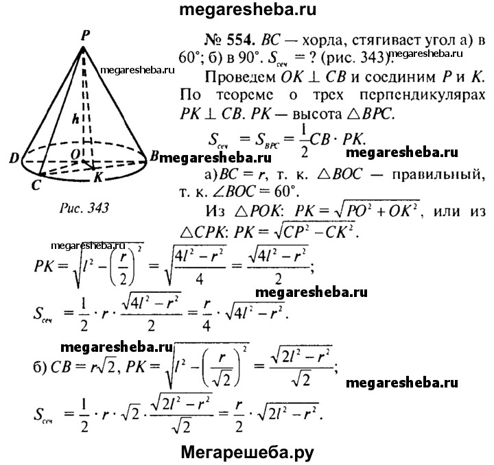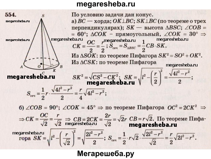 554. Образующая конуса равна i, а радиус основания равен r. Найдите площадь сечения, проходящего через вершину конуса и хорду основания, стягивающую дугу: а) в 60°; б) в 90°.