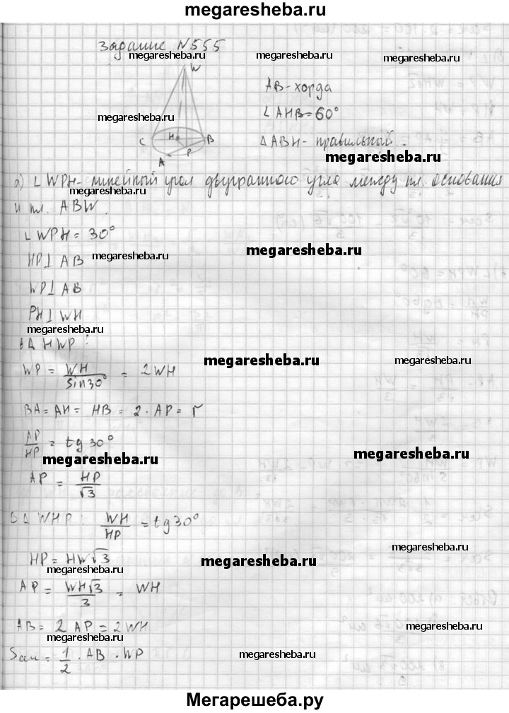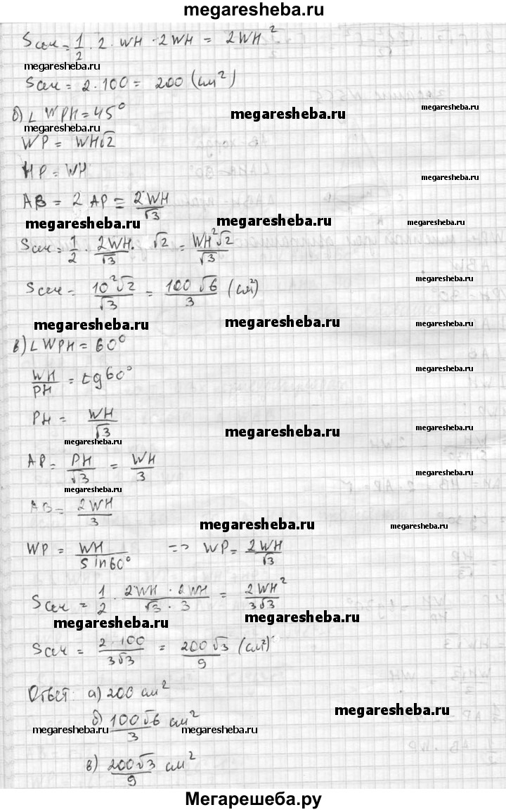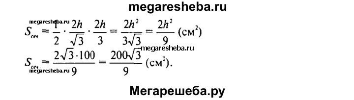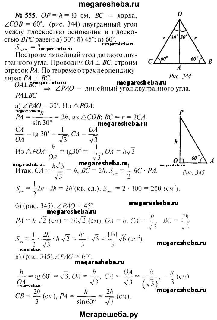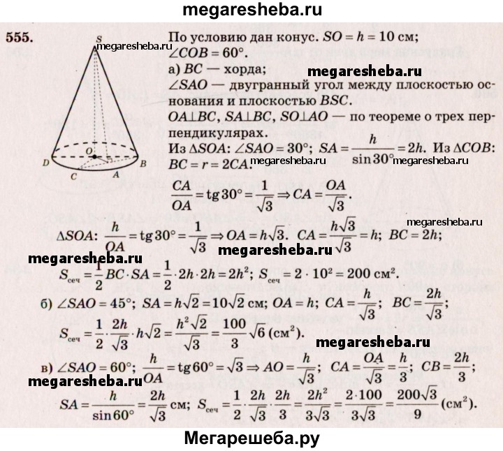 555. Высота конуса равна 10 см. Найдите площадь сечения, проходящего через вершину конуса и хорду основания, стягивающую дугу в 60°, если плоскость сечения образует с плоскостью основания конуса угол: а) 30°; б) 45°; в) 60°.