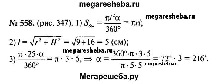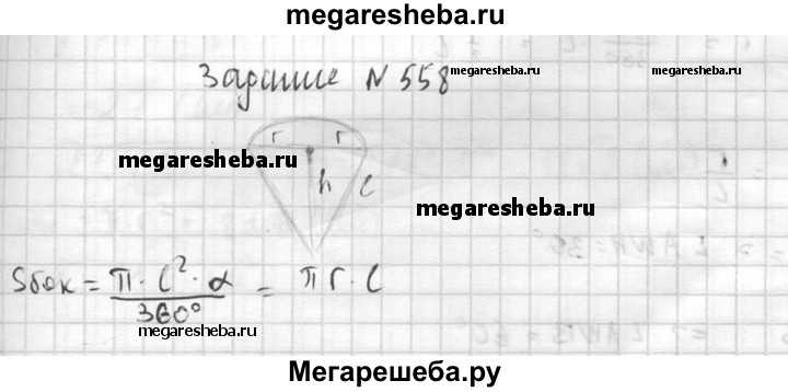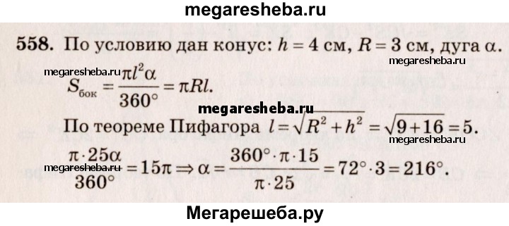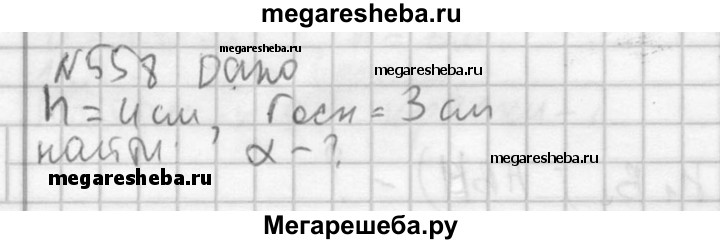 558. Разверткой боковой поверхности конуса является сектор с дугой α. Найдите α, если высота конуса равна 4 см, а радиус основания равен 3 см.