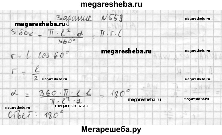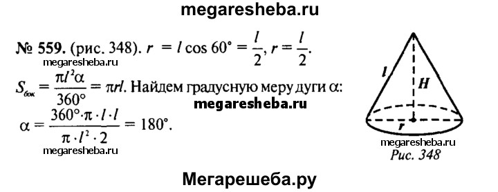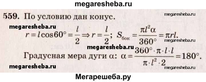 559. Найдите дугу сектора, представляющего собой развертку боковой поверхности конуса, если образующая конуса составляет с плоскостью основания угол в 60°.