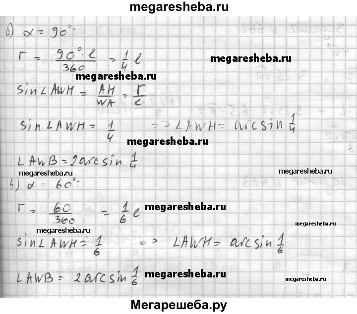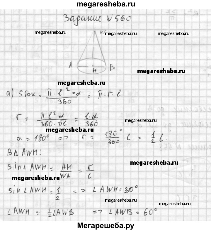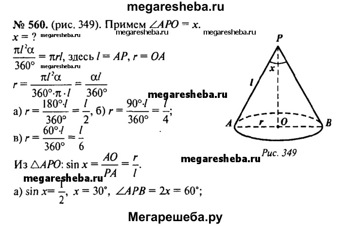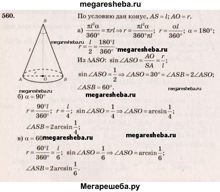 560. Найдите угол при вершине осевого сечения конуса, если разверткой его боковой поверхности является сектор с дугой, равной: а) 180°; б) 90°; в) 60°.
