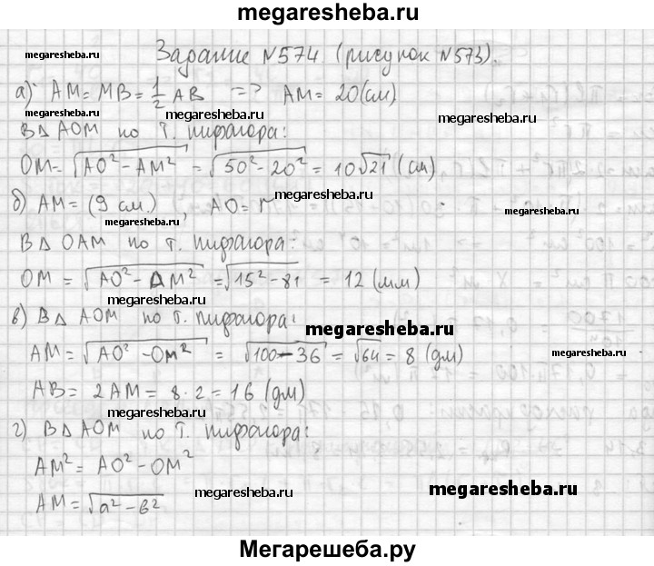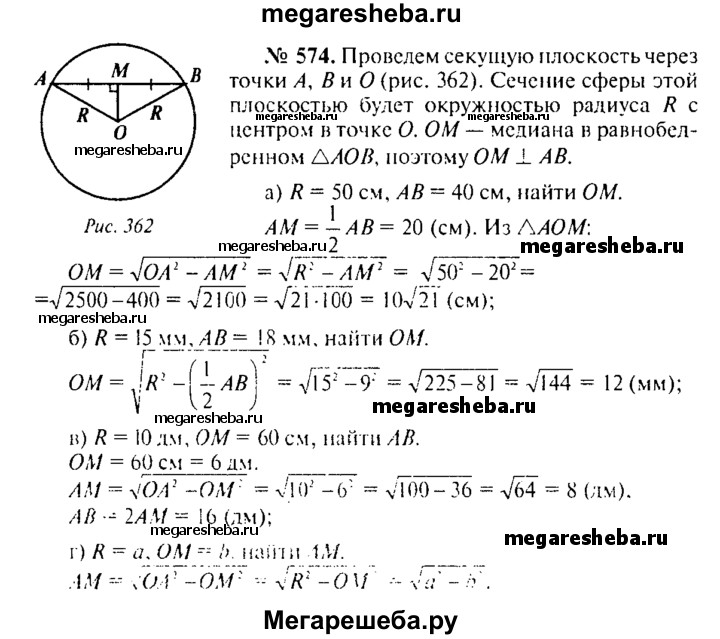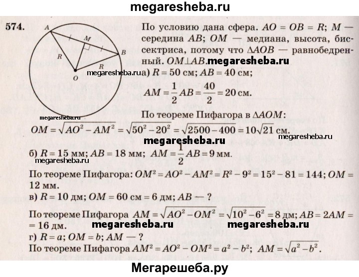 574. Точка М — середина отрезка АВ, концы которого лежат на сфере радиуса R с центром О. Найдите: а) ОМ, если R = 50 см, АВ = - 40 см; б) ОМ, если R = 15 мм, АВ = 18 мм; в) АВ, если R = 10 дм, ОМ = 60 см; г) AM, если R = a, ОМ = b.