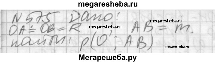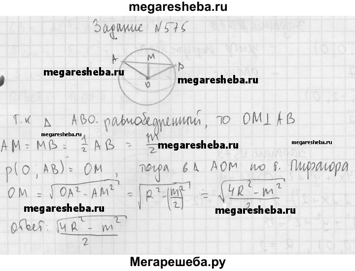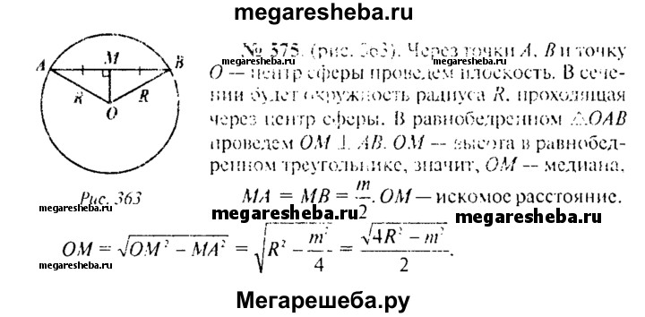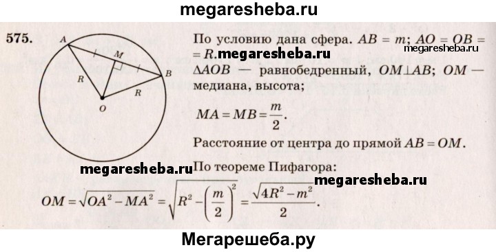 575. Точки А и В лежат на сфере радиуса R. Найдите расстояние от центра сферы до прямой АВ, если АВ = m.