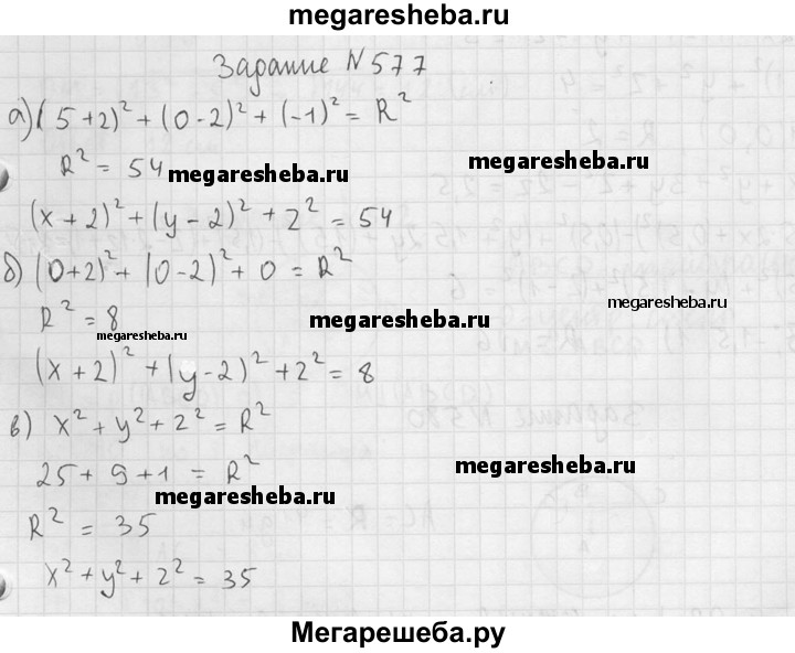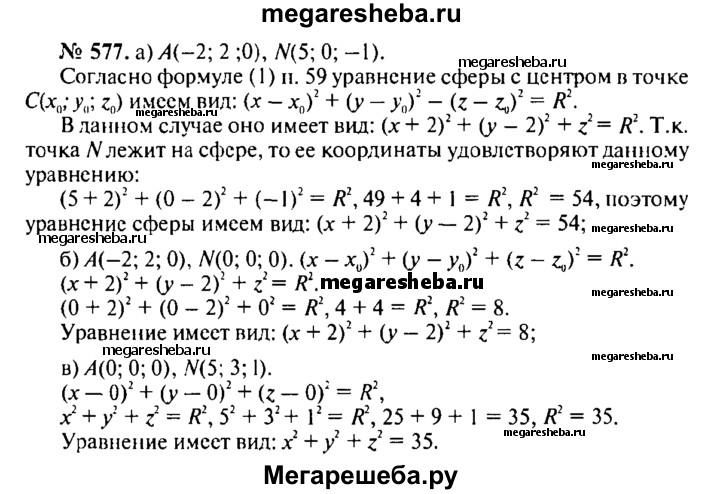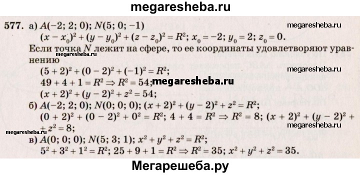 577. Напишите уравнение сферы с центром А, проходящей через точку N, если: а) А (-2; 2; 0), N (5; 0; -1); б) А (-2; 2; 0), N (0; 0; 0); в) А (0; 0; 0), N (5; 3; 1).