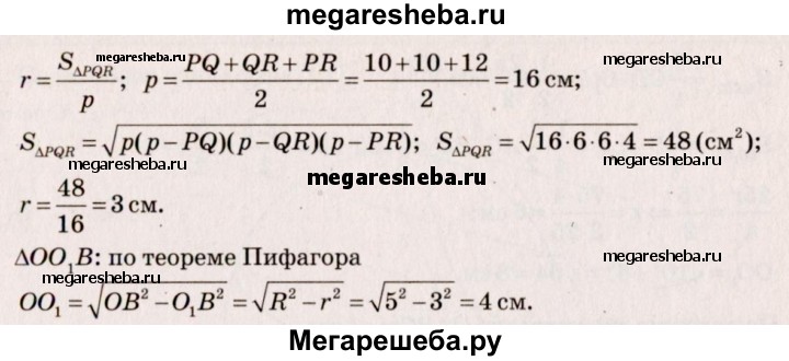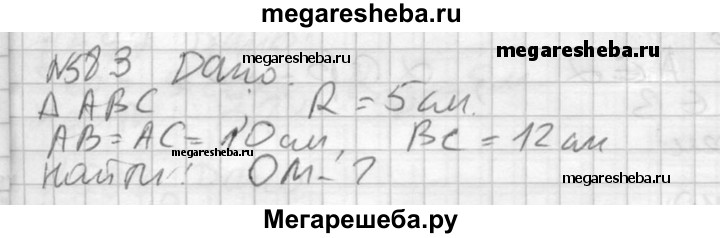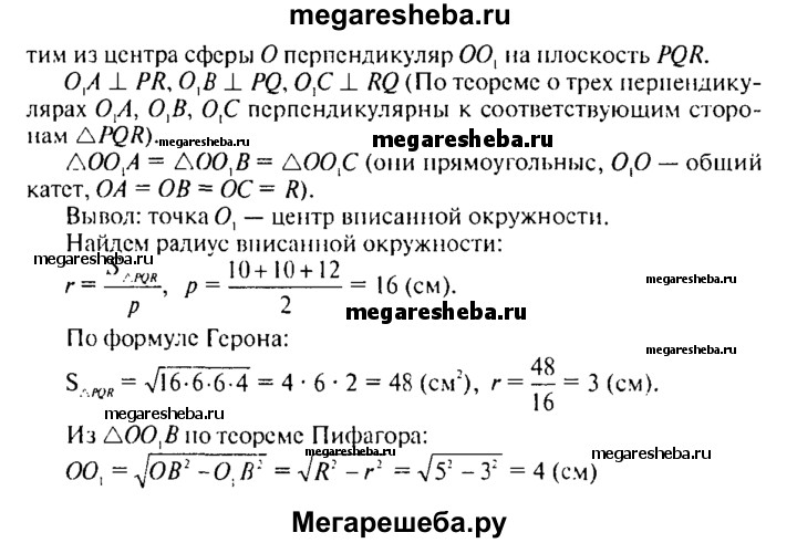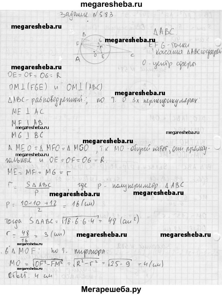 583. Стороны треугольника касаются сферы радиуса 5 см. Найдите расстояние от центра сферы до плоскости треугольника, если его стороны равны 10 см, 10 см и 12 см.