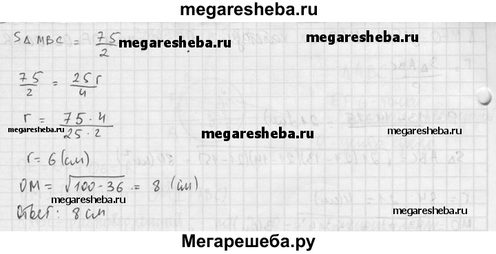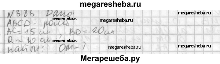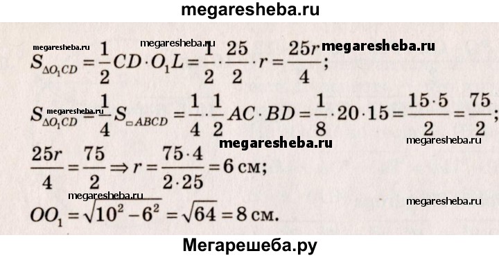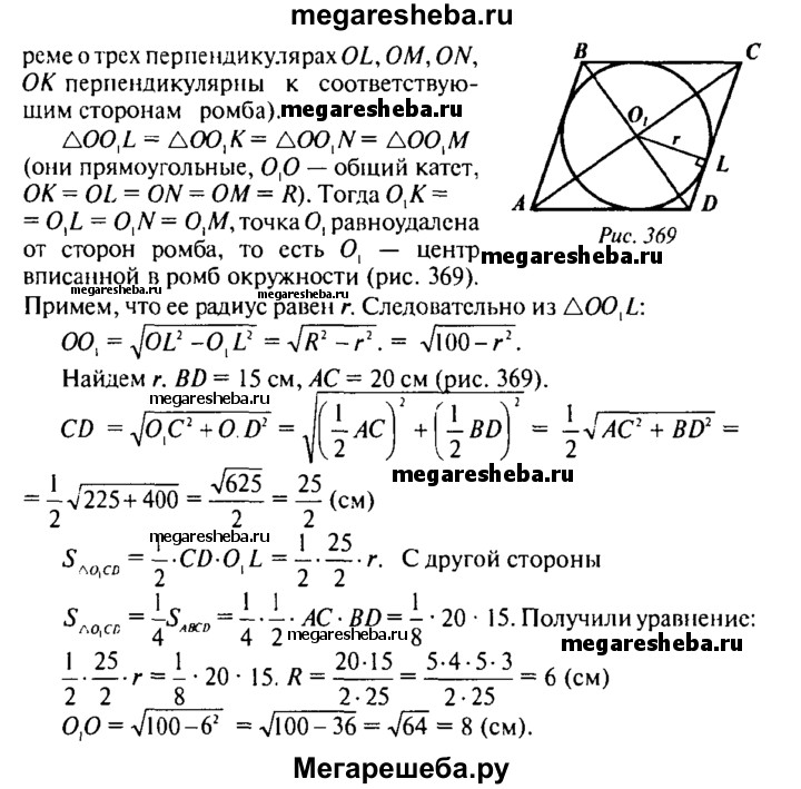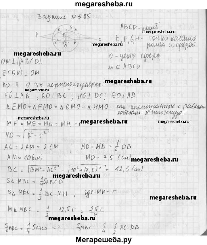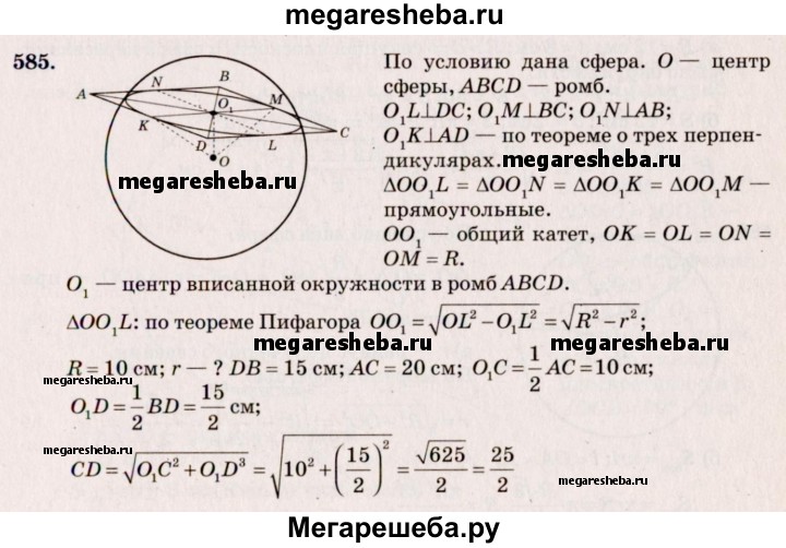 585. Все стороны ромба, диагонали которого равны 15 см и 20 см, касаются сферы радиуса 10 см. Найдите расстояние от центра сферы до плоскости ромба.