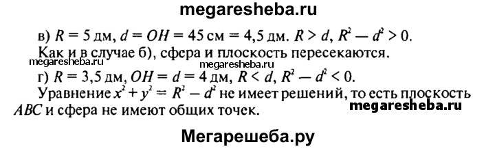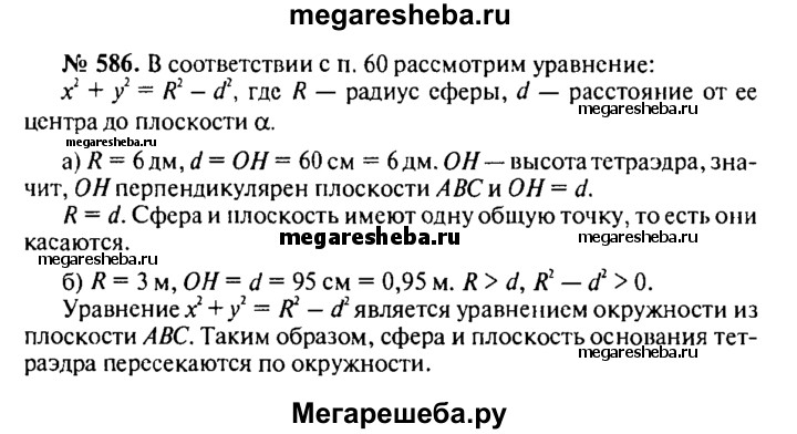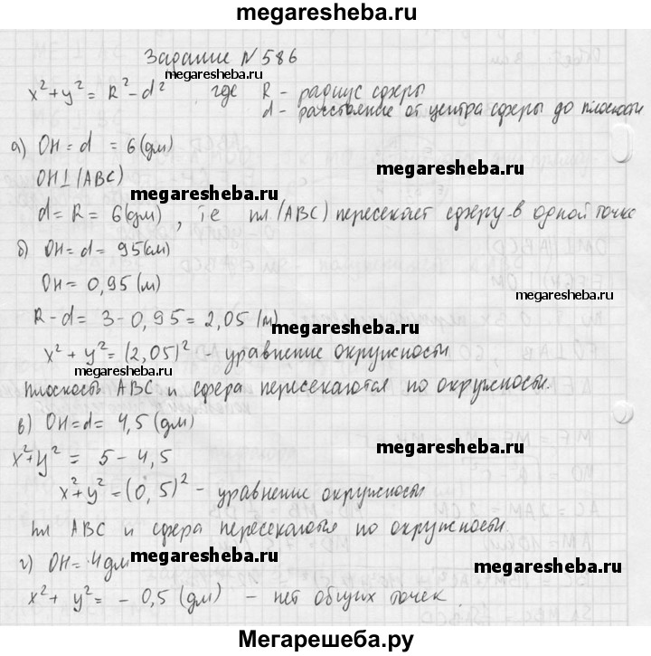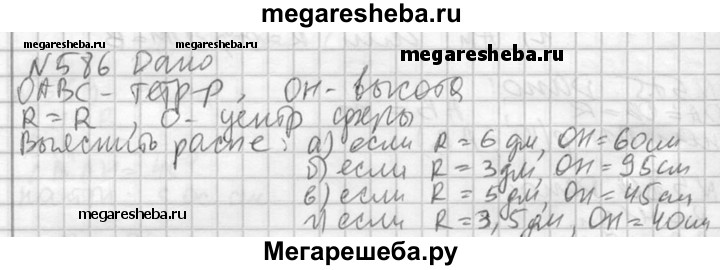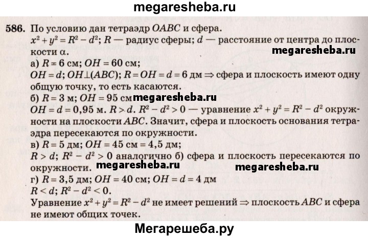 586. Отрезок ОН — высота тетраэдра ОАВС. Выясните взаимное расположение сферы радиуса R с центром О и плоскости ABC, если: а) R = 6 дм, ОН = 60 см; б) R = 3 м, ОН = 95 см; в) R = 5 дм, ОН = 45 см; г) R = 3,5 дм, ОН = 40 см.