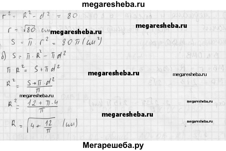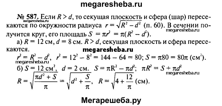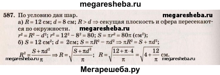 587. Расстояние от центра шара радиуса R до секущей плоскости равно d. Вычислите: а) площадь S сечения, если R = 12 см, d = 8 см; б)R, если площадь сечения равна 12 см², d = 2 см.