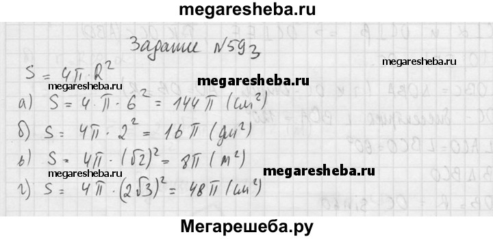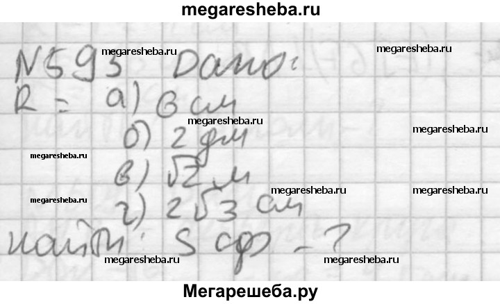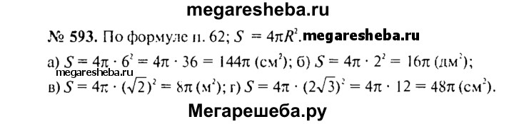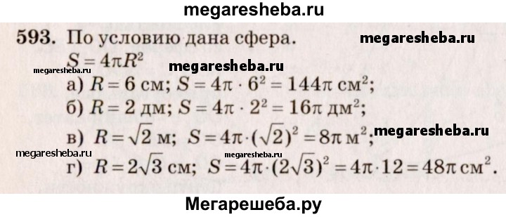 593. Найдите площадь сферы, радиус которой равен: а) 6 см; б) 2 дм; в) √2 м; г) 2√3 см.