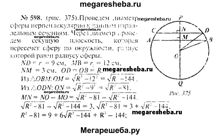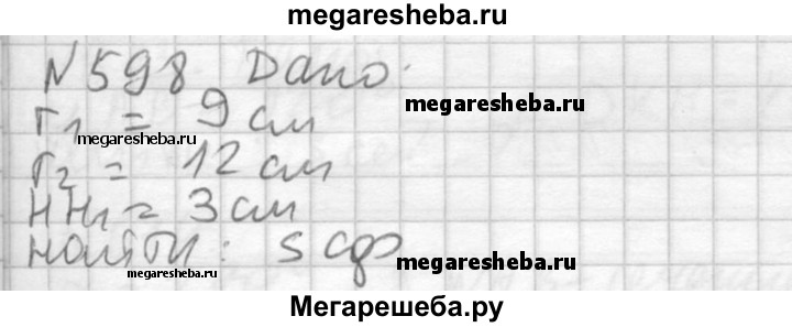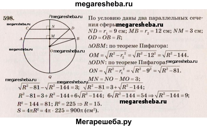 598. Радиусы двух параллельных сечений сферы равны 9 см и 12 см. Расстояние между секущими плоскостями равно 3 см. Найдите площадь сферы.