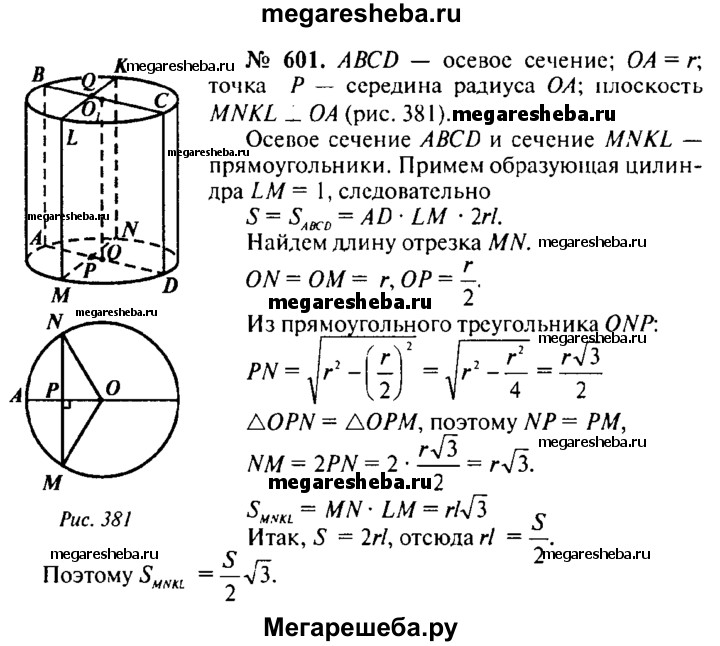 601. Площадь осевого сечения цилиндра равна S. Найдите площадь сечения цилиндра плоскостью, проходящей через середину радиуса основания перпендикулярно к этому радиусу.