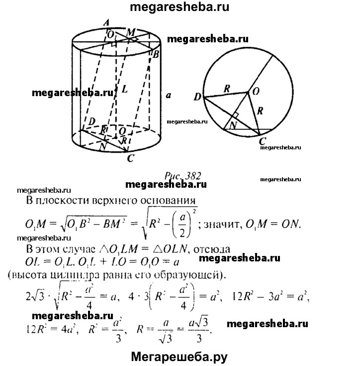 602. Вершины А и В прямоугольника ABCD лежат на окружности одного из оснований цилиндра, а вершины С и D — на окружности другого основания. Вычислите радиус цилиндра, если его образующая равна а, АВ = а, а угол между прямой ВС и плоскостью основания равен 60°.