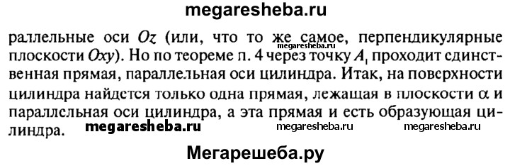 603. Докажите, что если плоскость параллельна оси цилиндра и расстояние между этой плоскостью и осью равно радиусу цилиндра, то плоскость содержит образующую цилиндра, и притом только одну. (В этом случае плоскость называется касательной плоскостью к цилиндру.)