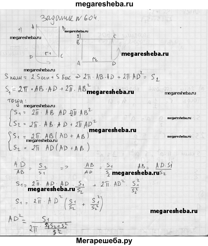 604. При вращении прямоугольника вокруг неравных сторон получаются цилиндры, площади полных поверхностей которых равны и S₂. Найдите диагональ прямоугольника.