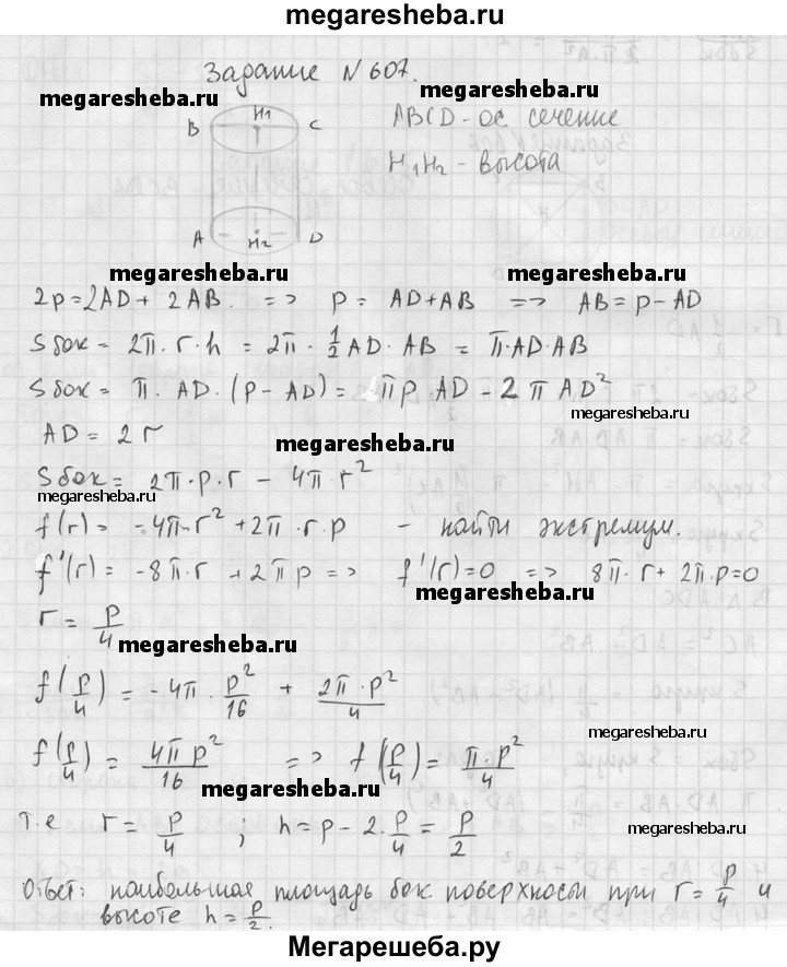 607. Найдите высоту и радиус цилиндра, имеющего наибольшую площадь боковой поверхности, если периметр осевого сечения цилиндра равен 2р.