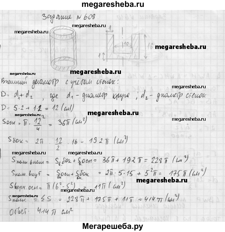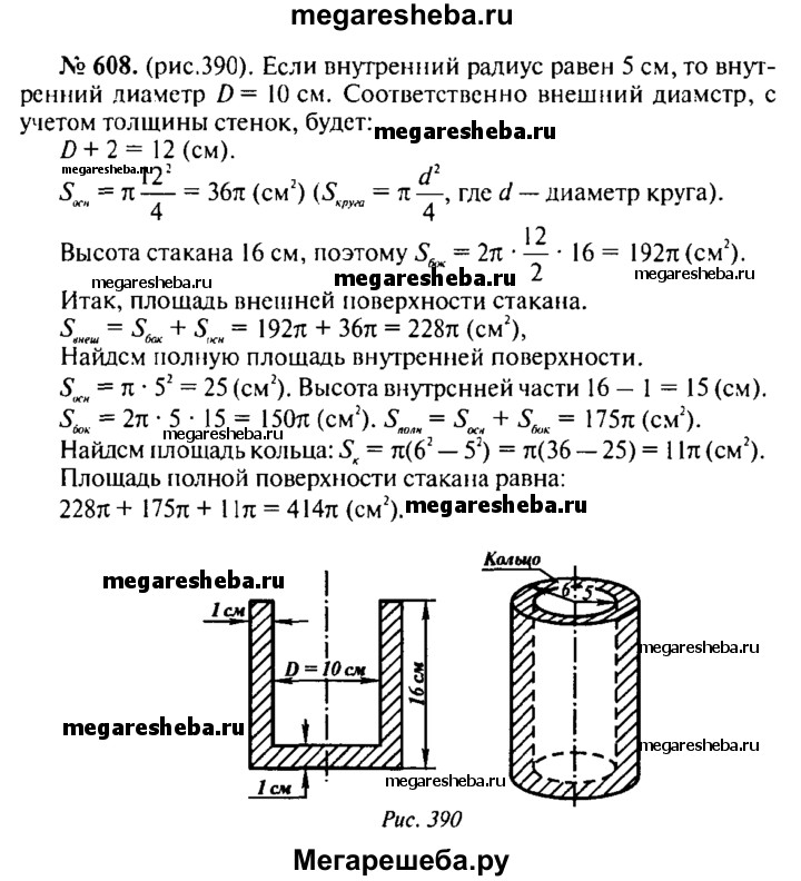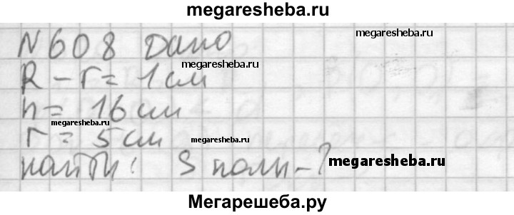 608. Толщина боковой стенки и дна стакана цилиндрической формы равна 1 см, высота стакана равна 16 см, а внутренний радиус равен 5 см. Вычислите площадь полной поверхности стакана.