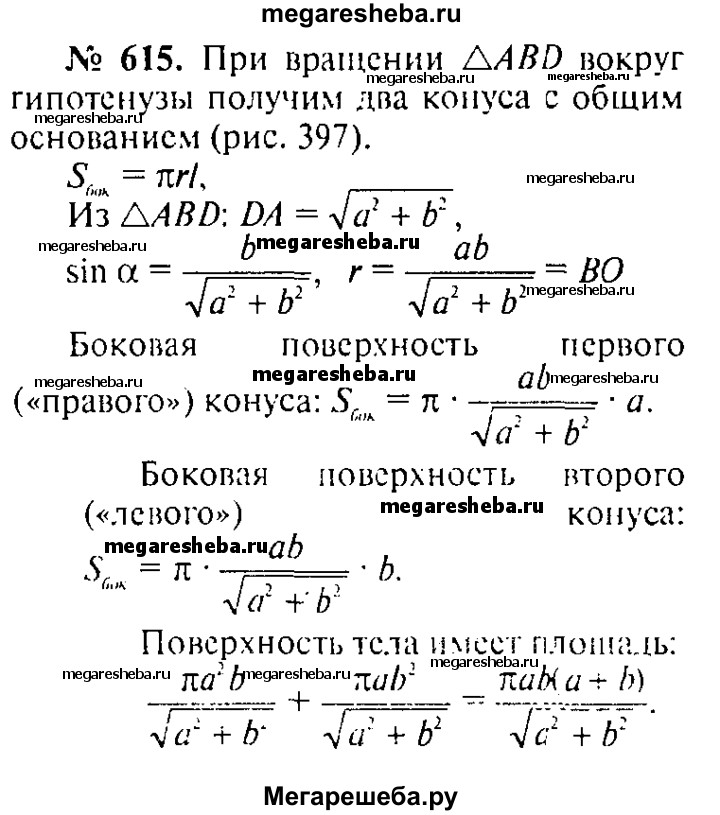 615. Прямоугольный треугольник с катетами а и b вращается вокруг гипотенузы. Найдите площадь поверхности полученного тела.