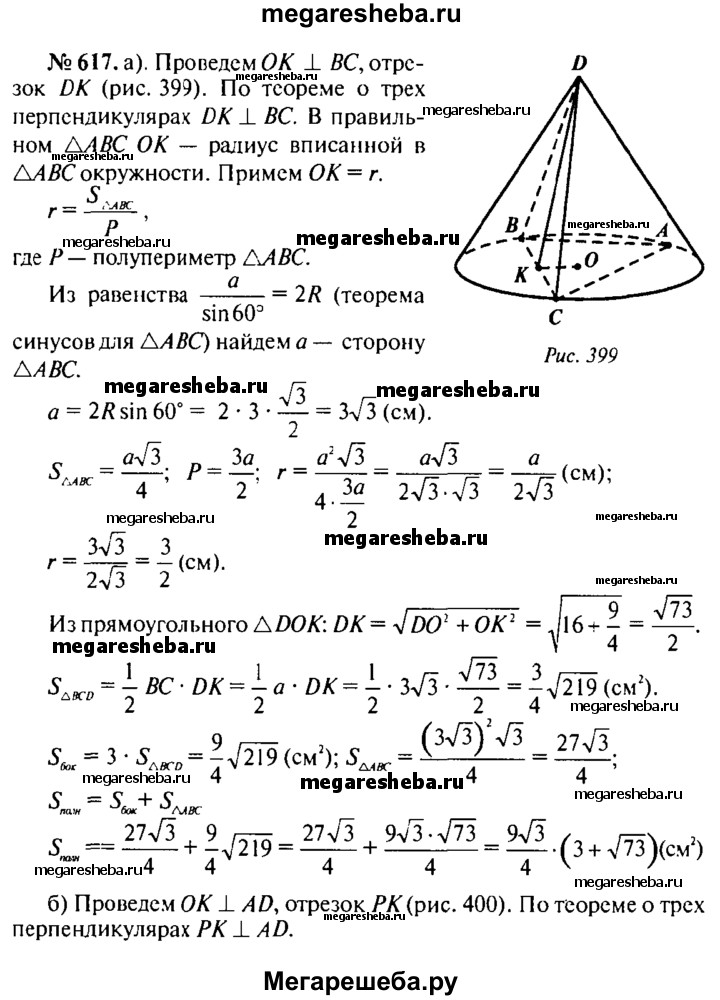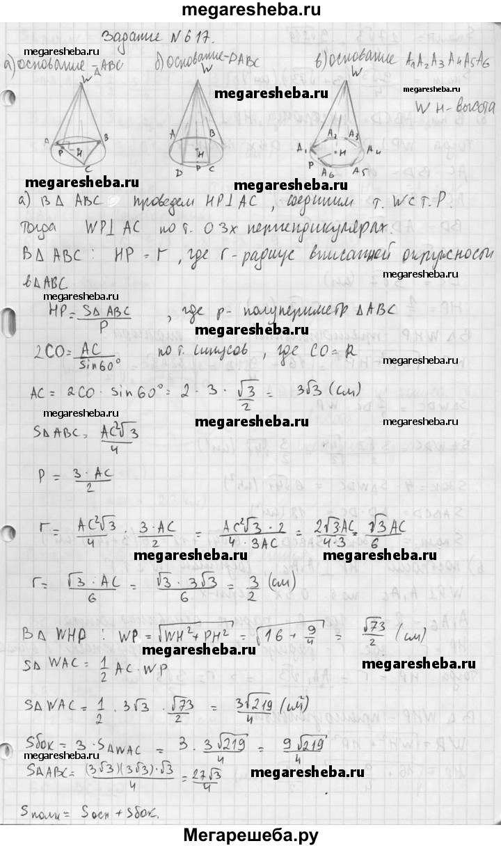 617. Высота конуса равна 4 см, а радиус основания равен 3 см. Вычислите площадь полной поверхности правильной n-угольной пирамиды, вписанной в конус, если: а) n = 3; б) n = 4; в) n = 6.