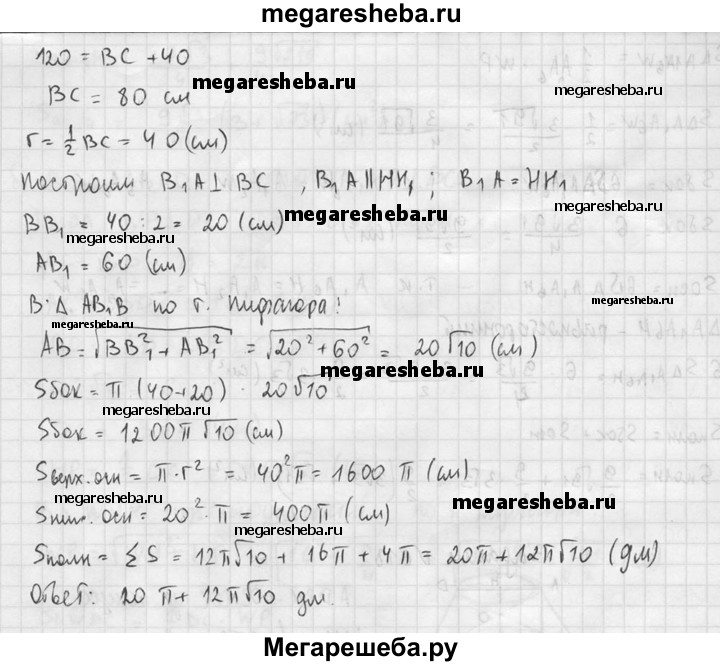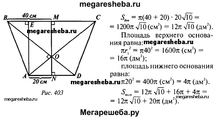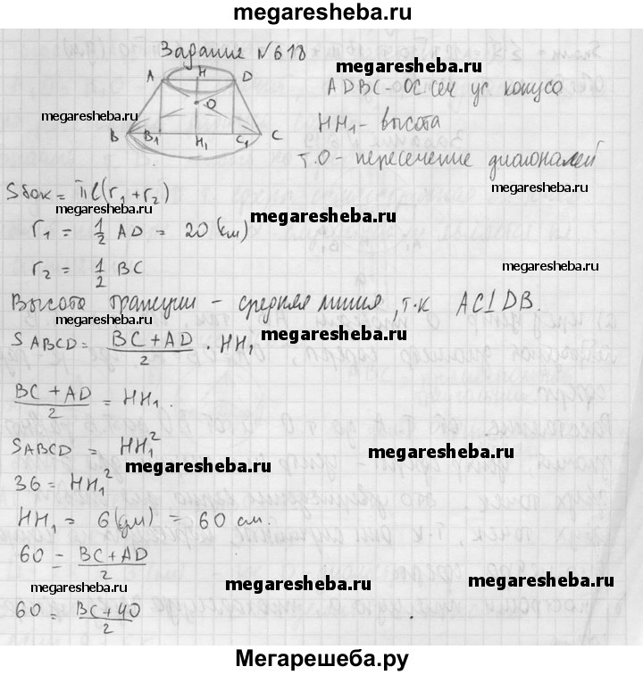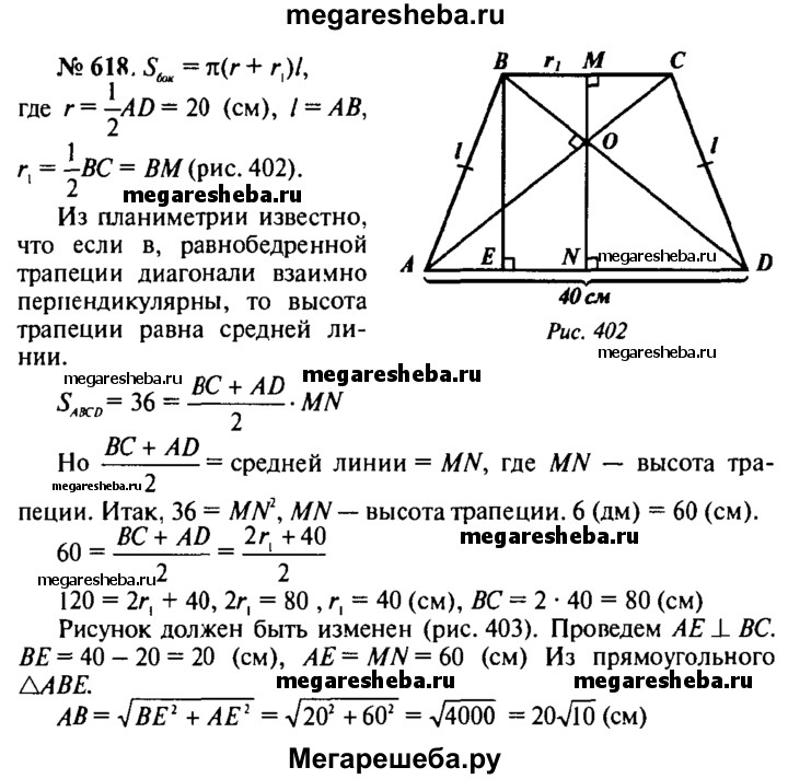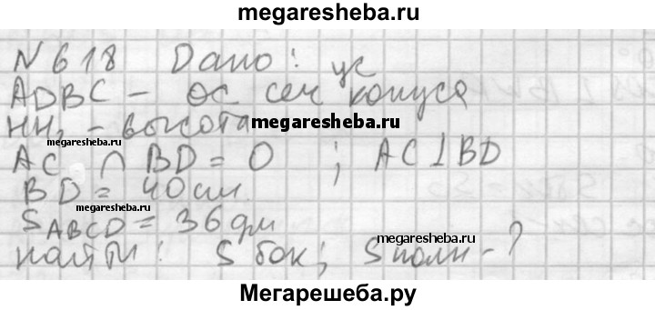 618. Диагонали осевого сечения усеченного конуса перпендикулярны. Одно из оснований осевого сечения равно 40 см, а его площадь равна 36 дм². Вычислите площади боковой и полной поверхностей усеченного конуса.