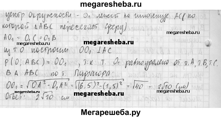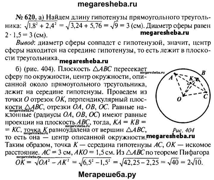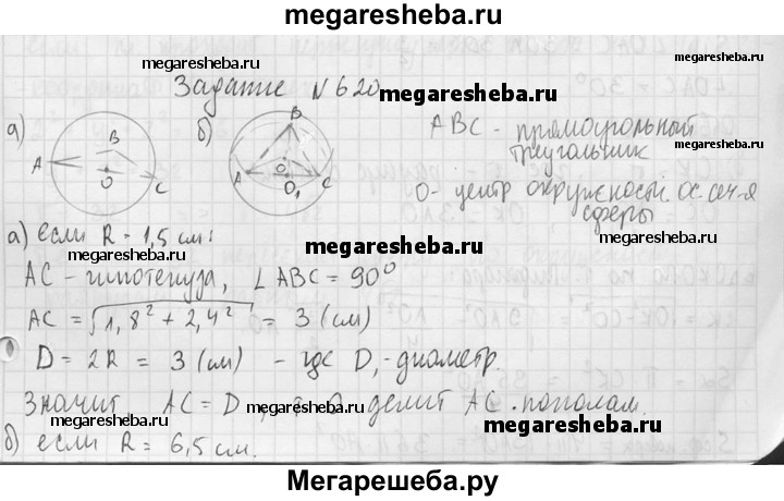 620. Вершины прямоугольного треугольника с катетами 1,8 см и 2,4 см лежат на сфере. а) Докажите, что если радиус сферы равен 1,5 см, то центр сферы лежит в плоскости треугольника, б) Найдите расстояние от центра сферы до плоскости треугольника, если радиус сферы равен 6,5 см.