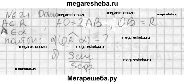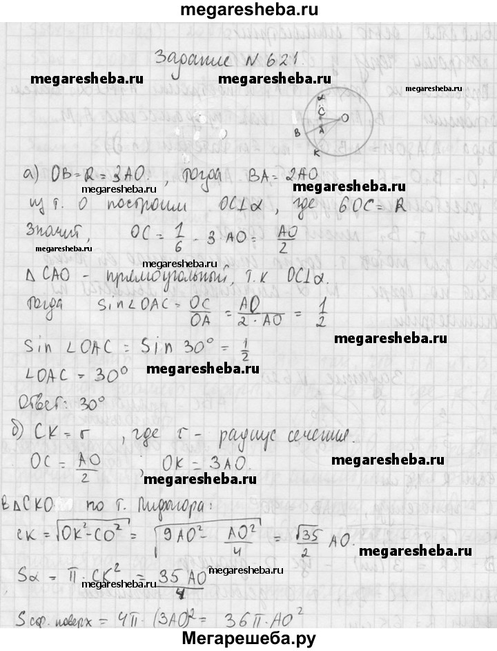 621. Точка А лежит на радиусе данной сферы с центром О и делит этот радиус в отношении 1 : 2, считая от центра сферы. Через точку А проведена плоскость α так, что радиус сферы с центром О, касающейся плоскости α, в 6 раз меньше радиуса данной сферы. Найдите: а) угол между прямой OA и плоскостью α; б) отношение площади сечения данной сферы плоскостью α к площади самой сферы.