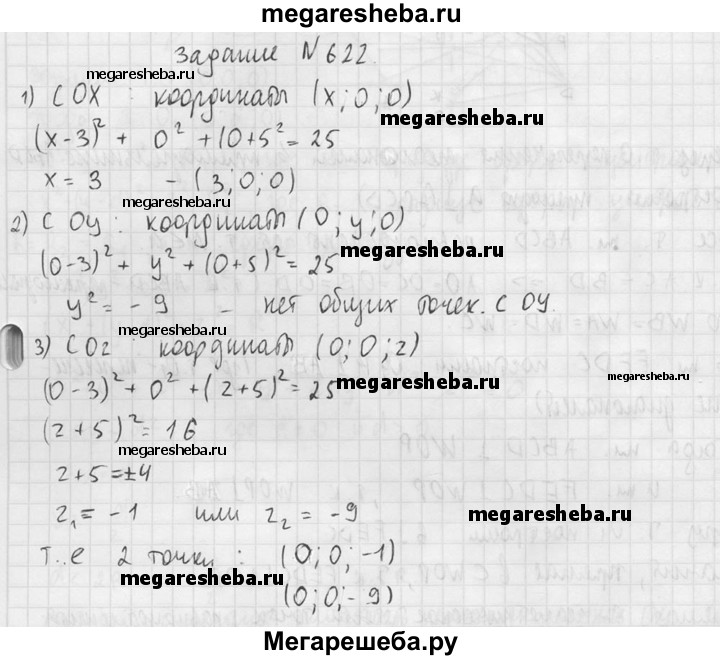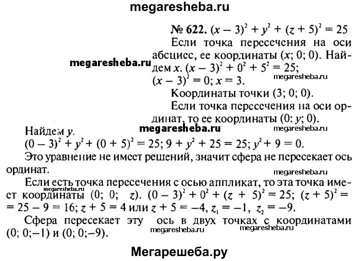 622. Найдите координаты точек пересечения сферы, заданной уравнением (х - З)² + у² + (z + 5)² = 25, с осями координат.