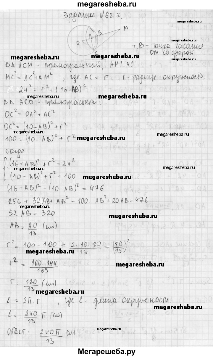 627. Вне сферы радиуса 10 см дана точка М на расстоянии 16 см от ближайшей точки сферы. Найдите длину такой окружности на сфере, все точки которой удалены от точки М на расстояние 24 см.