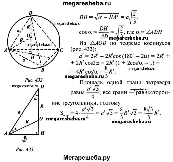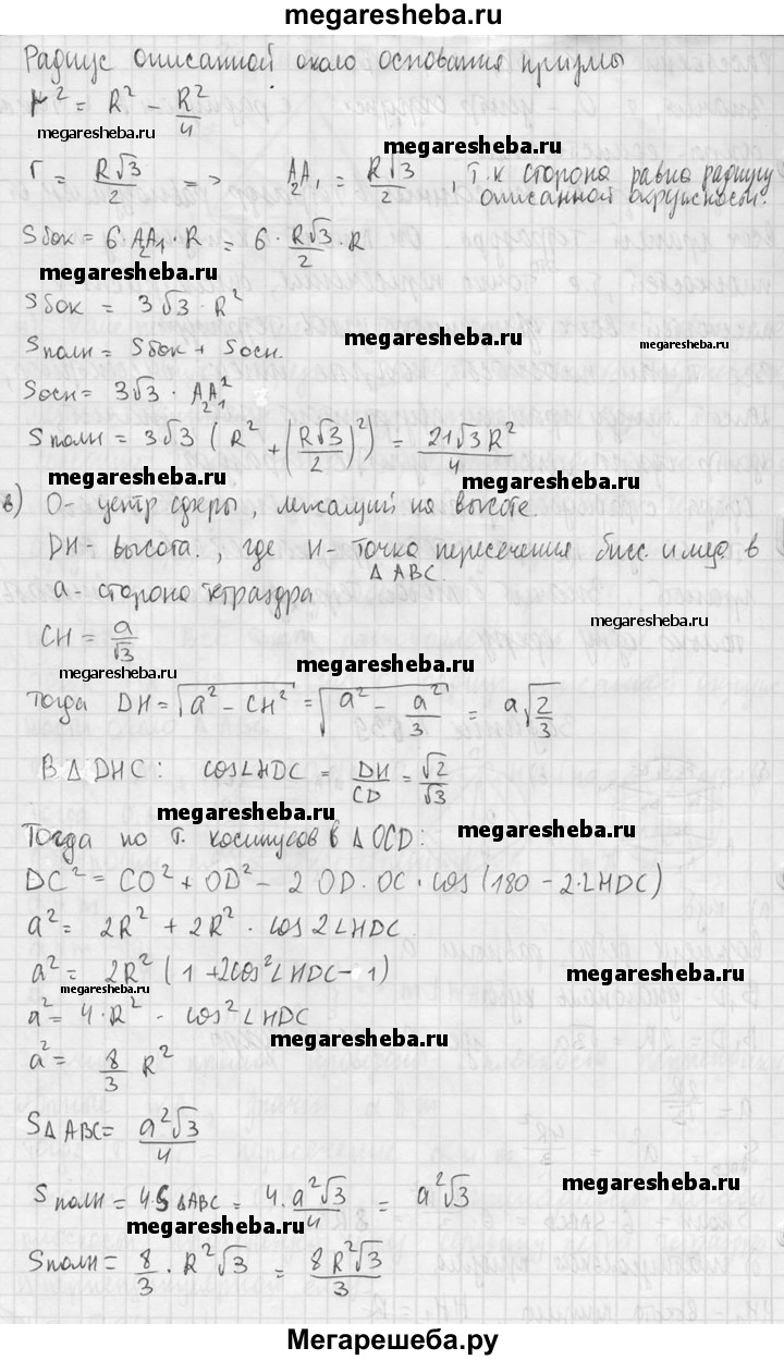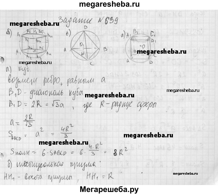 639. Радиус сферы равен R. Найдите площадь полной поверхности: а) вписанного в сферу куба; б) вписанной правильной шестиугольной призмы, высота которой равна R; в) вписанного правильного тетраэдра.
