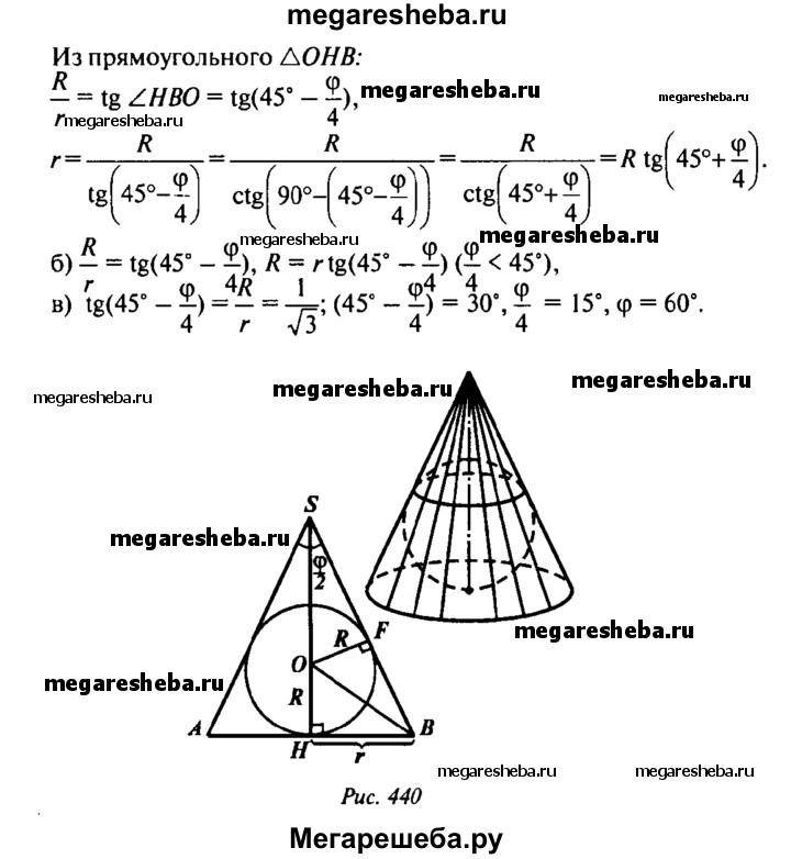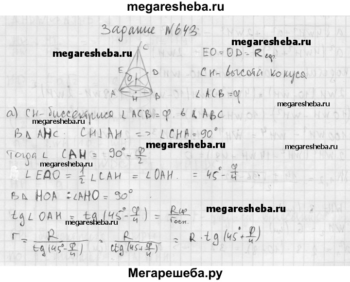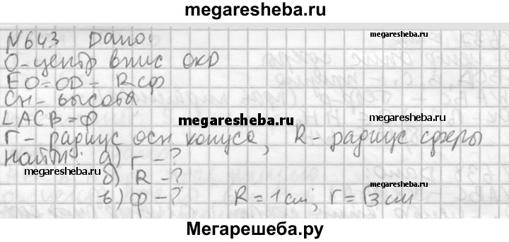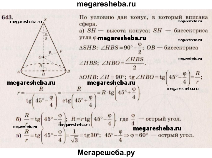 643. В конус с углом ф при вершине осевого сечения и радиусом основания r вписана сфера радиуса R (т. е. сфера касается основания конуса и каждой его образующей, рис. 172, б). Найдите: а) r, если известны R и ф; б) R, если известны r и ф; в) ф, если R= 1 см, r = √3 см.