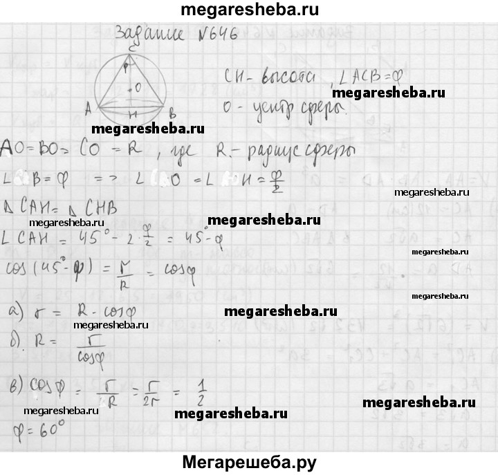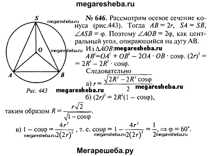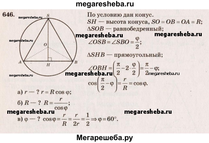 646. Конус с углом ф при вершине осевого сечения и радиусом основания r вписан в сферу радиуса R (т. е. вершина конуса лежит на сфере, а основание конуса является сечением сферы, рис. 173, б). Найдите: а) r, если известны R и ф; б) R, если известны r иф; в) ф, если R = 2г.