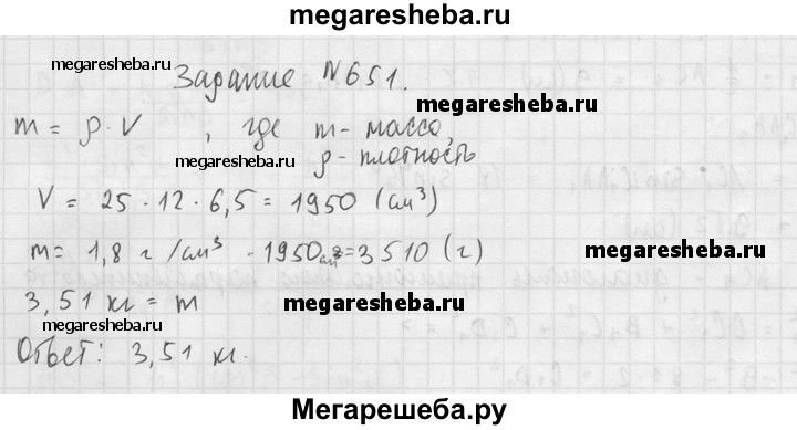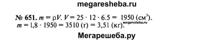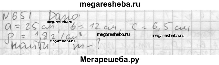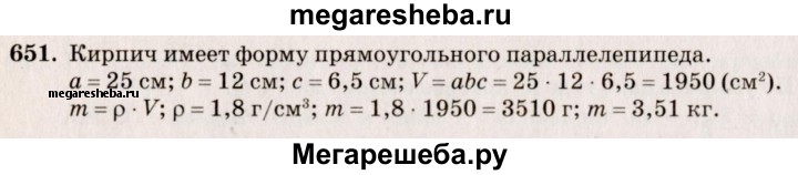 651. Кирпич имеет форму прямоугольного параллелепипеда с измерениями 25 см, 12 см и 6,5 см. Плотность кирпича равна 1,8 г/см³. Найдите его массу.