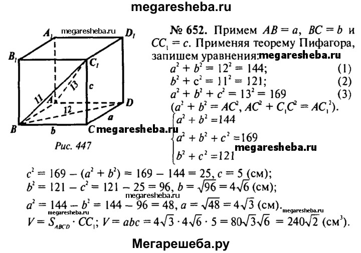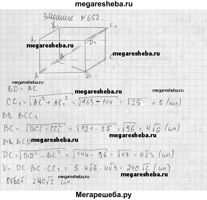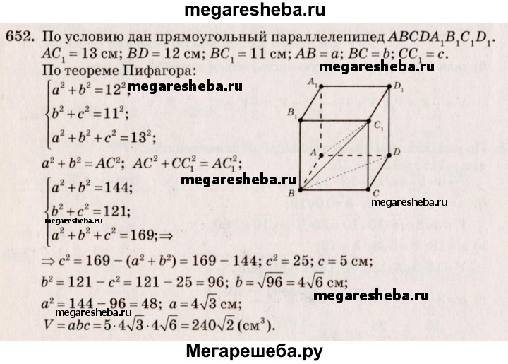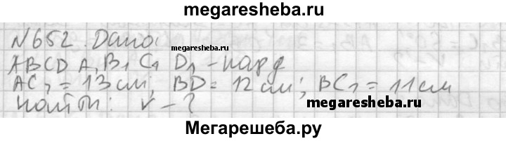 652. Найдите объем прямоугольного параллелепипеда ABCDA₁B₁C₁D₁, если АС₁ = 13 см, BD = 12 см и ВС₁ = 11 см.