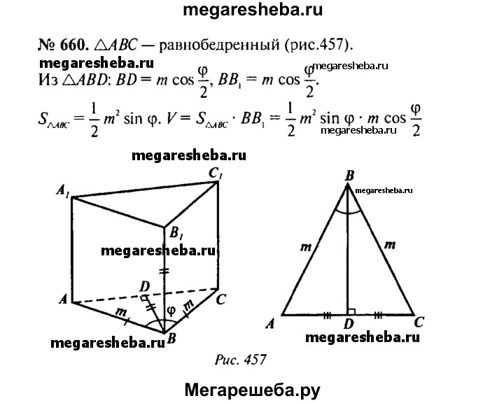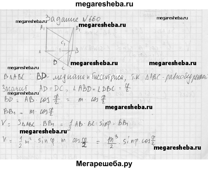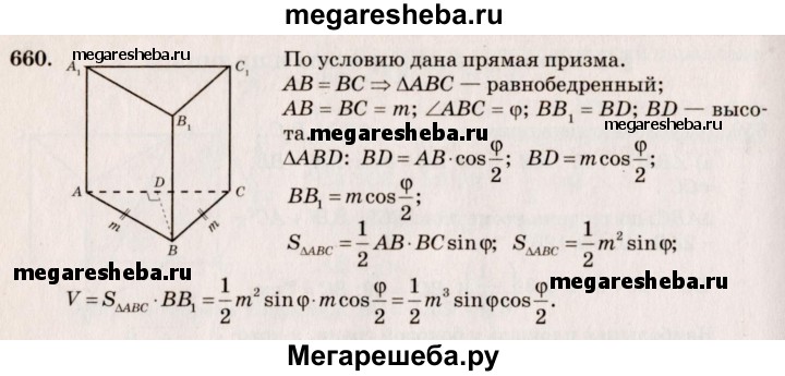 660. Найдите объем прямой призмы АВСА₁В₁С₁, если АВ = ВС = m, угол ABC = ф и ВВ₁ = BD, где BD — высота треугольника ABC.