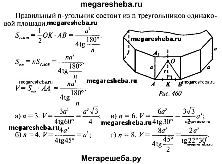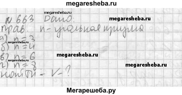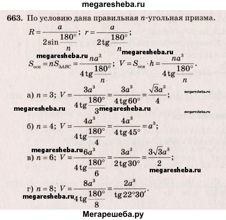 663. Найдите объем правильной n-угольной призмы, у которой каждое ребро равно а, если: а) n = 3; б) n = 4; в) n = 6; г) n = 8.