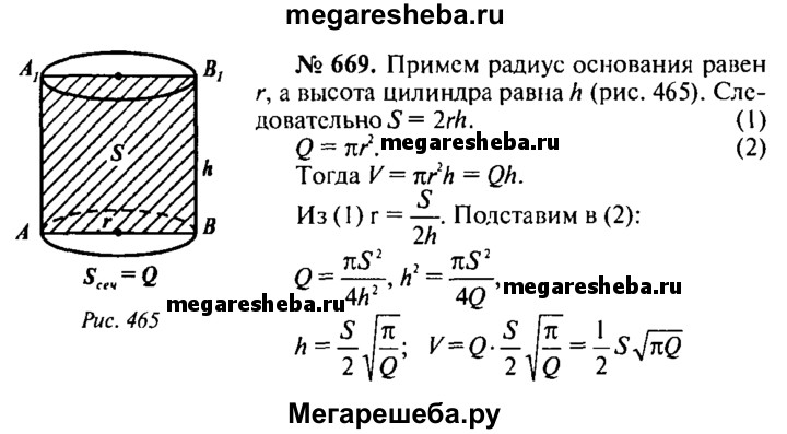 669. Площадь основания цилиндра равна Q, а площадь его осевого сечения равна S. Найдите объем цилиндра.
