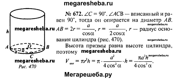 672. В цилиндр вписана призма, основанием которой является прямоугольный треугольник с катетом а и прилежащим к нему углом α. Найдите объем цилиндра, если высота призмы равна h.