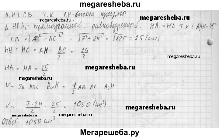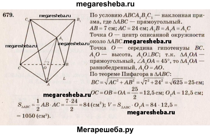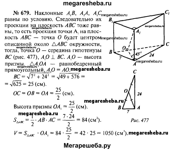 679. Основанием наклонной призмы АВСА₁В₁С₁ является прямоугольный треугольник ABC с катетами АВ = 7 см и АС = 24 см. Вершина А₁ равноудалена от вершин А, В и С. Найдите объем призмы, если ребро АА₁ составляет с плоскостью основания угол в 45°.